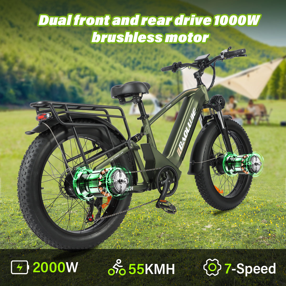 (b-side-2401)Baolujie Dual-Motor Electric Mountain Bike, 48V, 23AH, 2000W, 55km/h Top Speed, 26x4'' Tire Size, Adult Outdoor Mountain Cross-Country E-Bike